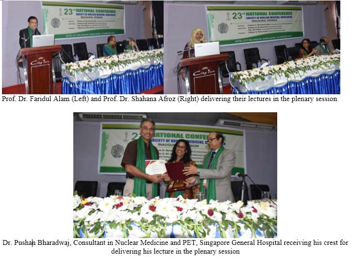 The 23rd National Conference of the Society of Nuclear Medicine, Bangladesh was successfully held inHotel City Inn, Khulna from 15-18 February 2018.It was attended by 175 participants including SNMB members, SNMB Associates, SNMBT members, accompanying persons, trade delegates as well as guests and volunteers. The inaugural session was on 16 February,2018.Prof. Dr. Muhammed Alamgir, Vice Chancellor, Khulna University of Engineering & Technology graced the occasion as chief guest. Engr. Jafar Sadique, Chairman BAEC and Professor Dr Md. Abdul Ahad, Principal, Khulna Medical College, Khulna were present as special guests. Dr.Md Mosharruf Hossain, PMO, INMAS, Rajshahi received the prestigious “Young Scientist Award” this year. This year there were Dr Pushan Bharadwaj, Consultant, Dept of Nuclear Medicine and Molecular Imaging, Singapore General Hospital delivered informative lectures in the plenary sessions. The participants were immensely benefited from the lectures of plenary sessions addressed by renowned nuclear medicine specialists from abroad as well as local learned speakers.The participants also shared their scientific research works through proferred oral presentations. The AGM was held on 15 February,2018.The Gala dinner and vibrant cultural show arranged by the local organizer Prof Dr. Ashoke Kumar Paul took placein the Hotel City Inn. The raffle draw took place to add enjoyment and laughter.